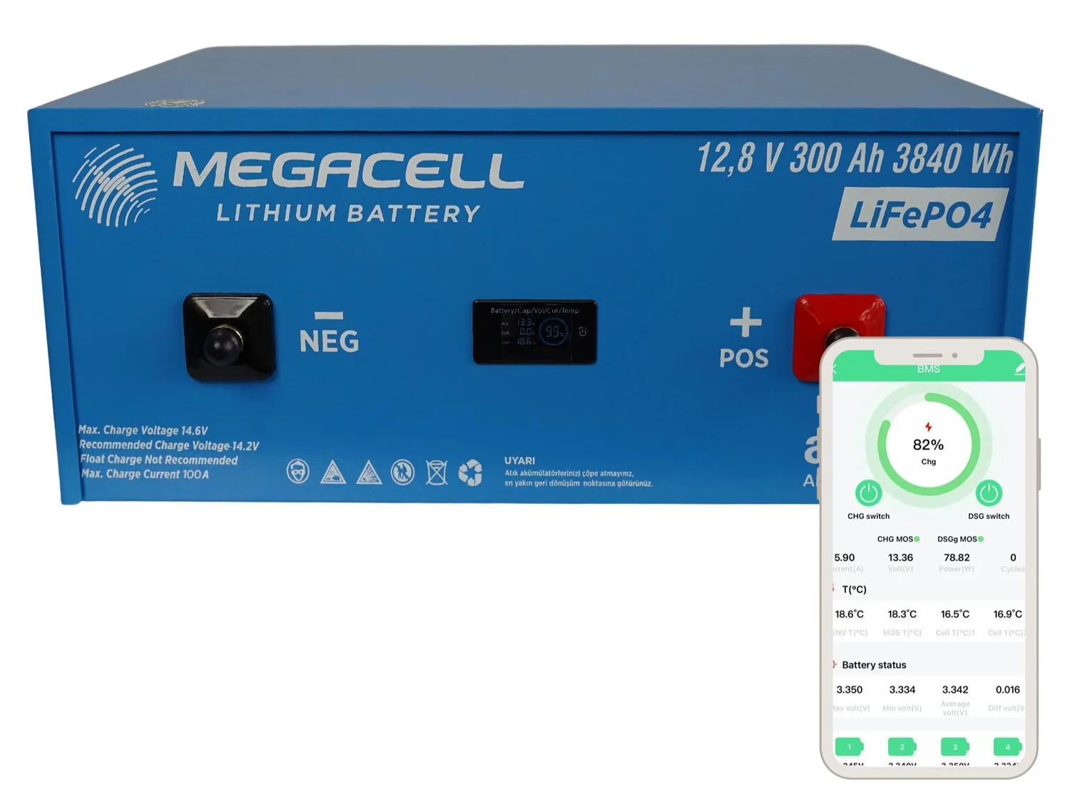 MEGACELL 12.8V – 300Ah – Bluetooth LiFePO4 Lityum Akü – Metal Kasa