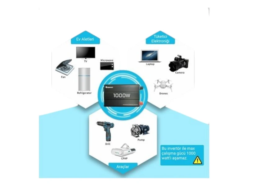 Renogy 1000W 12V tam Sinüs İnvertör 220V alet ve ekipmanlara güç vermenizi sağlayan bir DC’den AC’ye dönüştürücüdür.